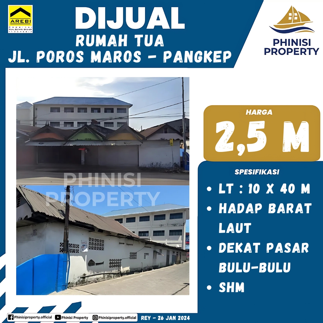Properti komersial potensial kini tersedia di Jalan Poros Maros-Pangkep. Rumah tua dengan luas lahan 10x40 meter ini menawarkan lokasi yang sangat strategis untuk investasi jangka panjang atau pengembangan usaha. Dengan posisi menghadap barat laut dan berada di dekat Pasar Bulu-Bulu, properti ini memiliki akses yang mudah dan visibilitas tinggi. Sangat ideal bagi Anda yang mencari lahan luas untuk membangun pusat bisnis atau hunian dengan nilai investasi tinggi.