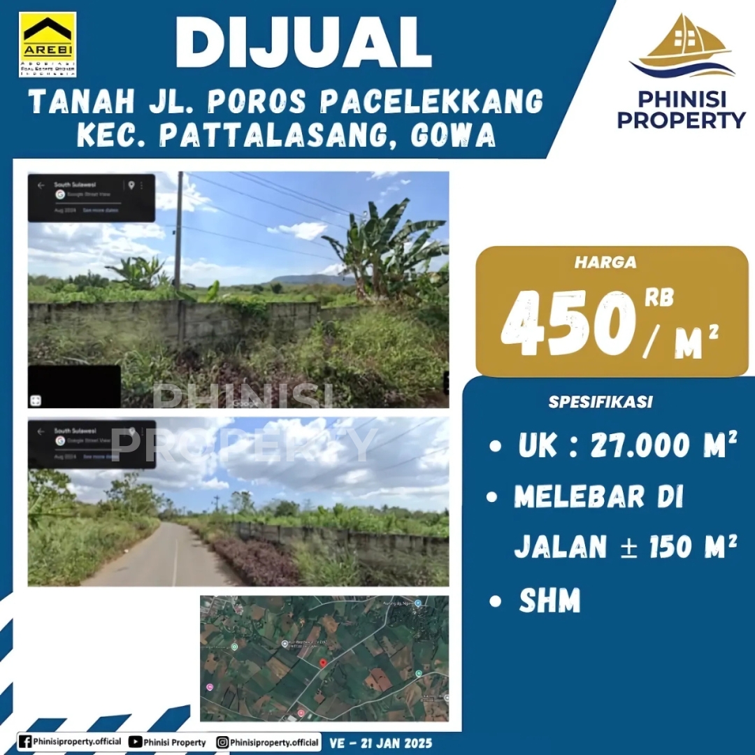 Dapatkan kesempatan investasi yang luar biasa dengan tanah sangat luas di Jalan Poros Pacelekkang, Kecamatan Pattalasang, Gowa. Properti ini menawarkan ukuran fantastis 27.000 M2 dan memiliki keunggulan melebar di jalan sekitar 150 meter, menjadikannya sangat strategis untuk pengembangan skala besar seperti kawasan industri, pergudangan, perumahan, atau proyek agrobisnis. Dengan harga 450 Ribu per meter persegi dan status kepemilikan Sertifikat Hak Milik (SHM), tanah ini menjamin legalitas dan potensi pengembangan jangka panjang yang optimal di wilayah Gowa yang terus tumbuh pesat.