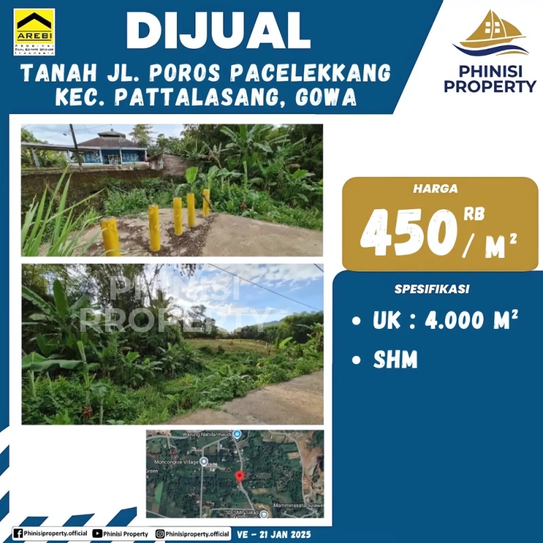 Dapatkan kesempatan untuk memiliki kavling tanah luas di Jalan Poros Pacelekkang, Kecamatan Pattalasang, Gowa, sebuah lokasi yang strategis dan berpotensi tinggi untuk berbagai pengembangan. Tanah ini memiliki ukuran 4.000 M2, sangat ideal untuk pembangunan gudang, fasilitas komersial, atau sebagai investasi jangka panjang. Dengan harga 450 Ribu per meter persegi dan status kepemilikan Sertifikat Hak Milik (SHM), Anda dapat bertransaksi dengan aman dan nyaman. Kavling di Poros Pacelekkang ini merupakan pilihan cerdas bagi Anda yang mencari aset tanah dengan skala besar dan prospek pengembangan yang menjanjikan di wilayah Gowa yang terus berkembang.
