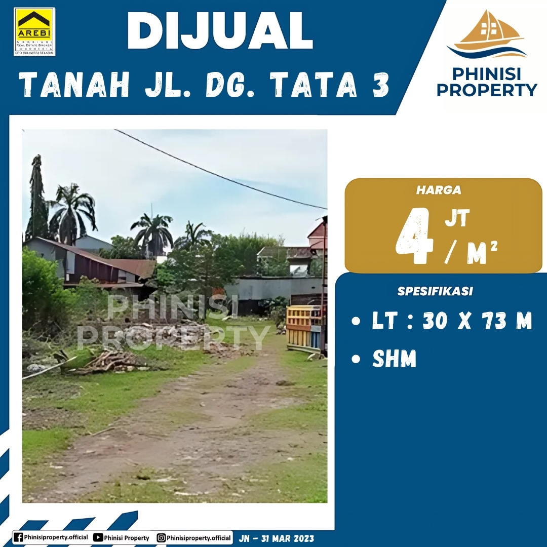 Dijual sebidang tanah di lokasi yang sangat strategis, tepatnya di Jalan Daeng Tata 3 Poros. Tanah ini memiliki ukuran 30 x 73 meter, dengan total luas 2.190 meter persegi. Sertifikat kepemilikannya adalah Sertifikat Hak Milik (SHM). Lokasinya yang berada di pinggir jalan utama sangat ideal untuk pengembangan properti komersial, seperti ruko, gudang, atau properti bisnis lainnya.