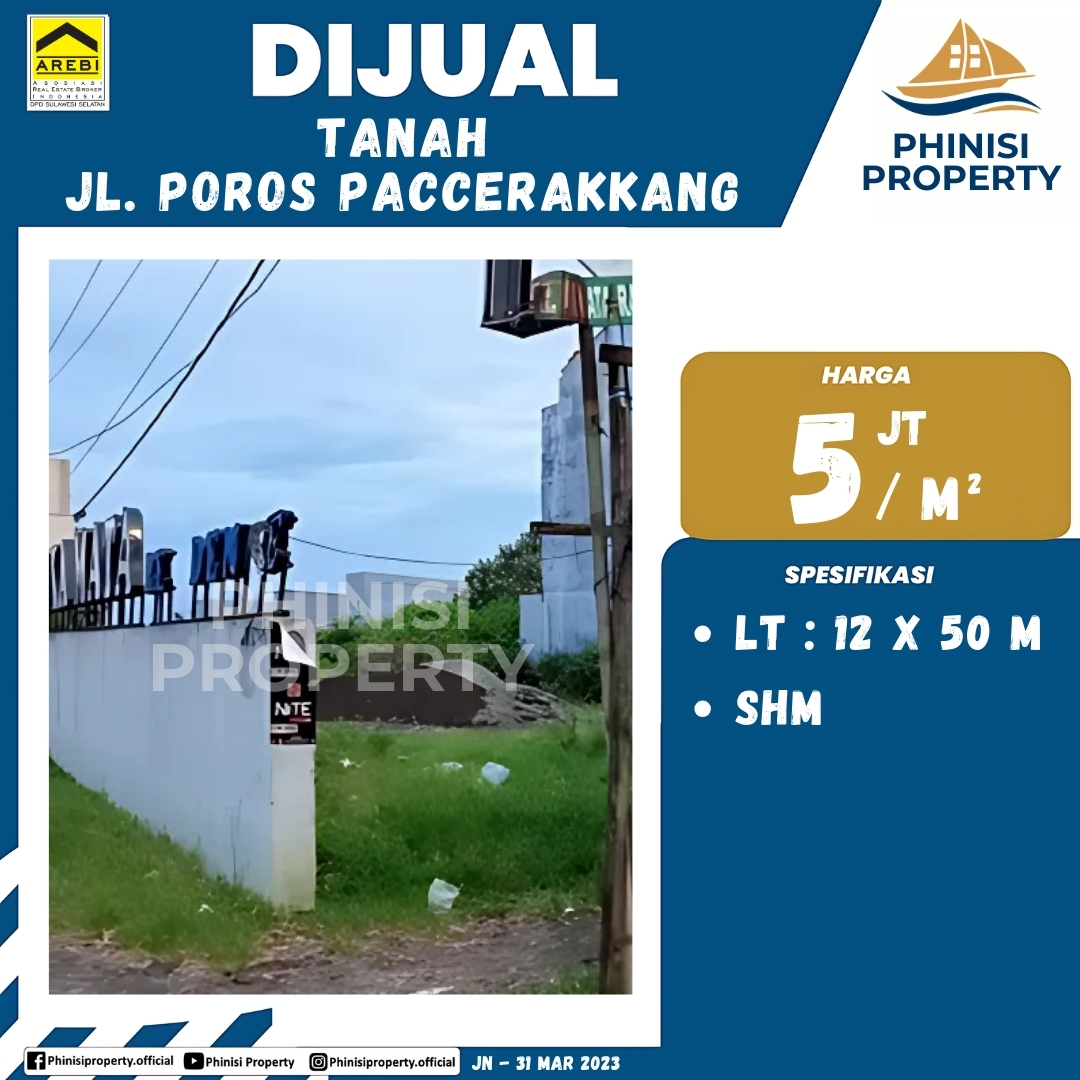 Dijual sebidang tanah dengan lokasi strategis di Jalan Paccerakkang Poros. Tanah ini memiliki ukuran 12 x 50 meter, dengan total luas 600 meter persegi. Sertifikat kepemilikannya adalah Sertifikat Hak Milik (SHM). Lokasi yang berada di pinggir jalan utama menjadikannya sangat ideal untuk pengembangan properti komersial, seperti ruko, gudang, atau properti bisnis lainnya.
