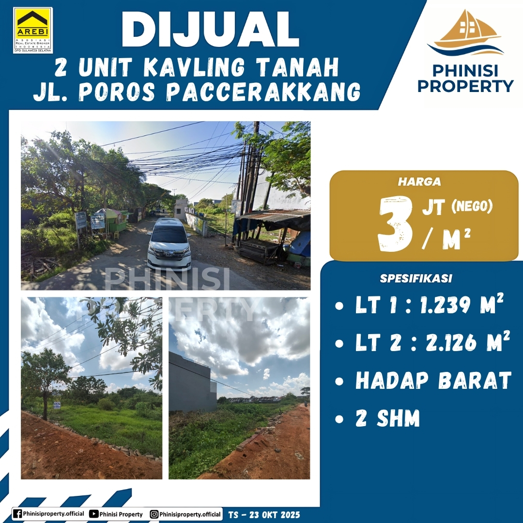 Dijual sebidang tanah dengan lokasi strategis di Jalan Paccerakkang Poros. Sertifikat kepemilikannya adalah Sertifikat Hak Milik (SHM). Lokasi yang berada di pinggir jalan utama menjadikannya sangat ideal untuk pengembangan properti komersial, seperti ruko, gudang, atau properti bisnis lainnya.