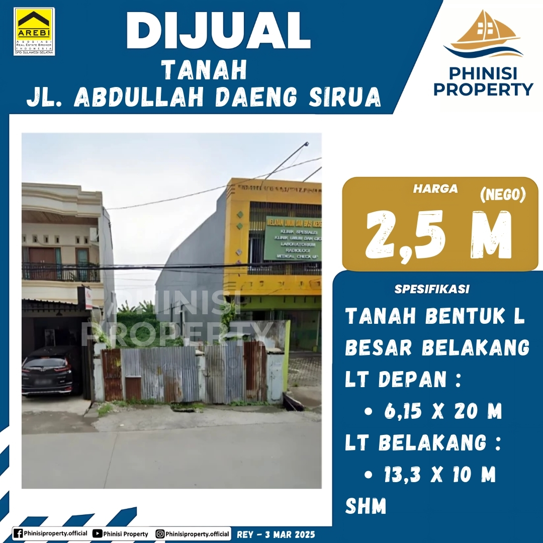 Dijual tanah komersial dengan bentuk unik L yang berlokasi sangat strategis di Jl. Abdullah Daeng Sirua. Properti ini memiliki spesifikasi luas tanah depan 6,15 x 20 meter dan luas tanah belakang 13,3 x 10 meter, menawarkan fleksibilitas desain yang luar biasa untuk berbagai jenis pembangunan. Bentuk tanah yang melebar di bagian belakang memberikan privasi dan ruang tambahan, menjadikannya ideal untuk dibangun ruko, kostan, atau bahkan klinik. Dengan sertifikat Hak Milik (SHM) yang menjamin legalitas, properti ini adalah investasi yang sangat menjanjikan. Lokasi yang mudah diakses dan berada di kawasan padat penduduk membuat properti ini memiliki potensi bisnis yang sangat tinggi.