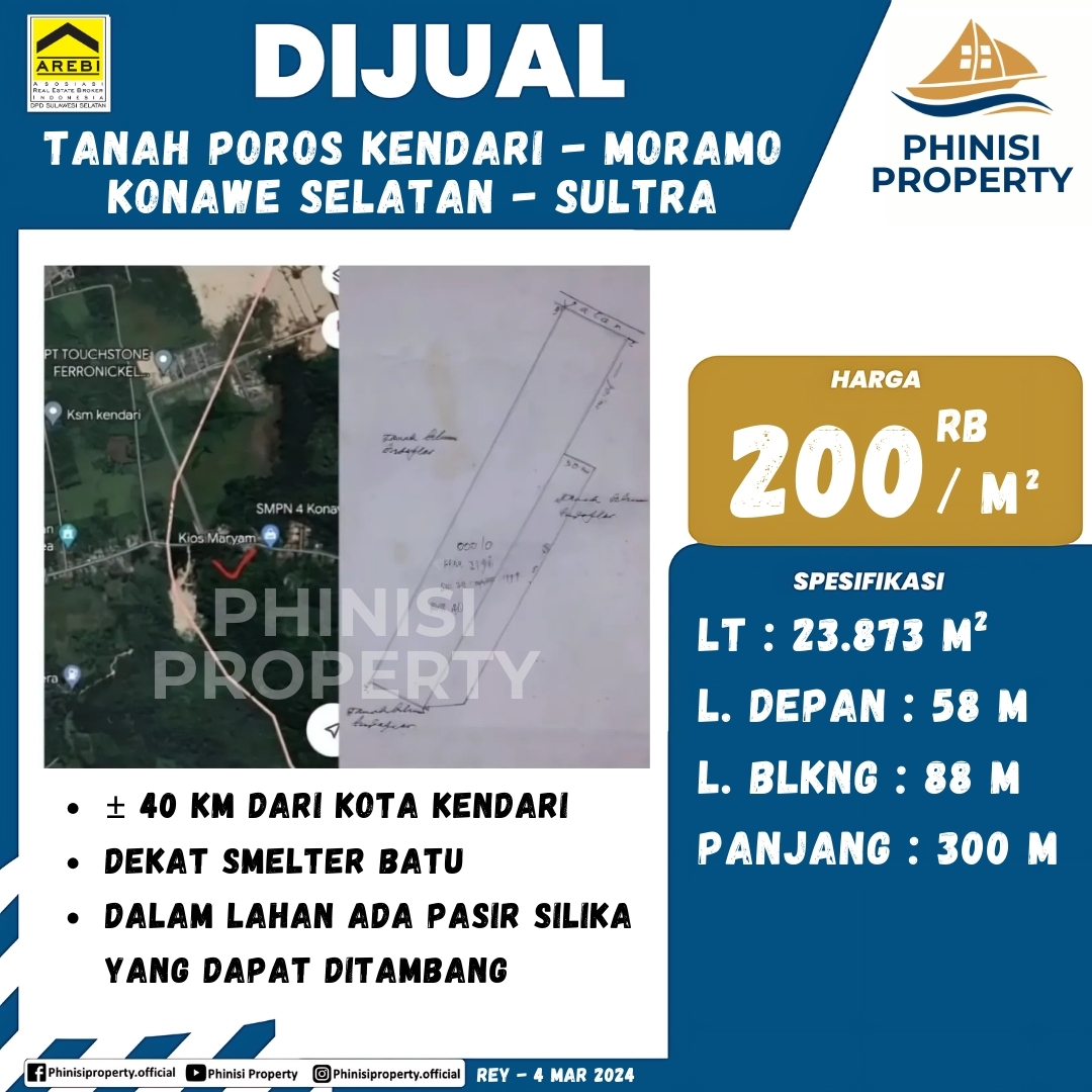 Dijual tanah super strategis yang terletak di Jalan Poros Kendari-Moramo, Konawe Selatan, Sulawesi Tenggara, ideal untuk investasi atau pengembangan bisnis. Dengan luas tanah mencapai 23.873m², lahan ini memiliki lebar depan 58 meter, lebar belakang 88 meter, dan panjang 300 meter. Keunggulan lokasi ini adalah keberadaannya sekitar 40 km dari Kota Kendari, dekat dengan smelter batu, dan memiliki pasir silika yang bisa ditambang. Properti ini menawarkan potensi keuntungan besar dari segi pertambangan maupun pengembangan komersial.