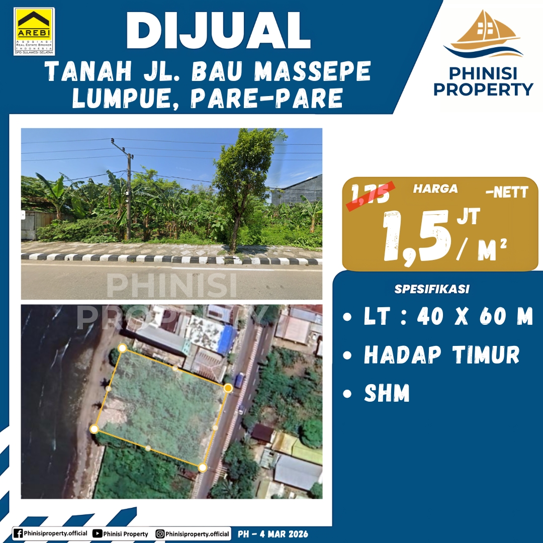 Dijual Tanah Jl. Bau Massepe, Lumpue, Pare-Pare - Jalan Bau Massepe, Bacukiki Barat, Parepare, Barru, Sulawesi Selatan, Sulawesi, 91114, Indonesia