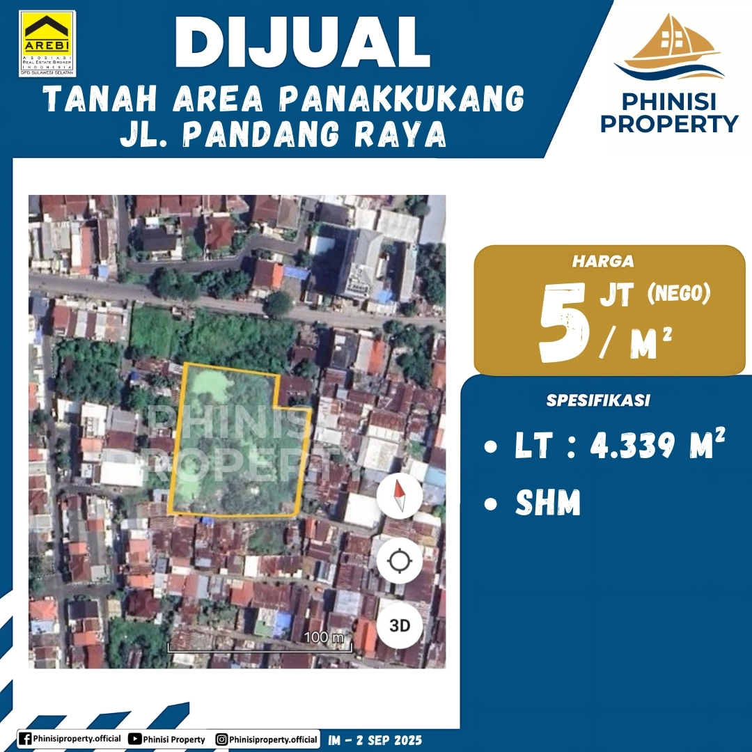Dijual tanah strategis di Jalan Pandang Raya, Panakkukang, yang sangat ideal untuk investasi atau pengembangan properti komersial. Tanah ini memiliki luas total 4.339 m2, sangat cocok untuk dibangun perumahan, ruko, atau properti komersial lainnya. Lokasinya yang berada di area Panakkukang menjadikan aksesnya mudah ke berbagai fasilitas publik. Sertifikat Hak Milik (SHM) sudah tersedia, memastikan proses jual beli yang aman dan terjamin.