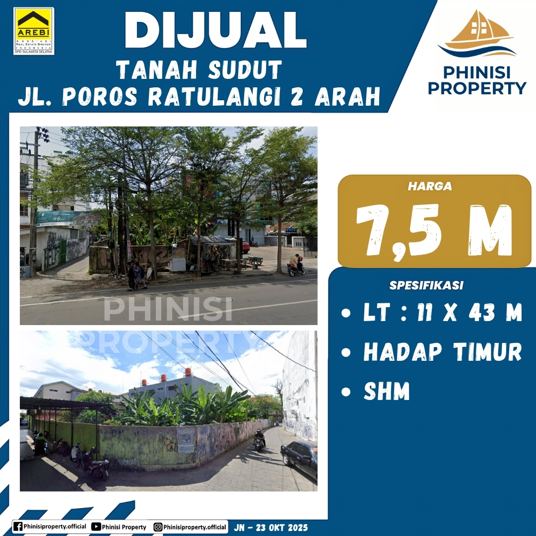 Dijual tanah kavling istimewa dengan posisi sudut (hoek) yang sangat strategis di Jalan Poros Ratulangi, jalan dua arah yang memiliki nilai komersial tinggi. Lahan ini sangat ideal untuk pembangunan ruko, kantor, atau showroom karena posisinya yang menjamin visibilitas maksimal. Tanah ini memiliki spesifikasi luas yang memadai, dengan ukuran total luas tanah (LT) 11 x 43 meter. Keuntungan tambahan, lahan ini menghadap Timur, menjanjikan pencahayaan pagi yang baik, dan yang terpenting, berstatus Sertifikat Hak Milik (SHM) yang menjamin kepastian dan keamanan legalitas properti. Jangan lewatkan peluang untuk berinvestasi di aset properti komersial yang menjanjikan ini.