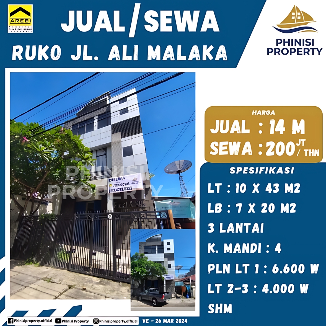 Temukan peluang bisnis terbaik dengan ruko 3 lantai di Jl. Ali Malaka, Makassar. Tersedia untuk dijual dengan harga 14 Milyar atau disewakan seharga 200 Juta/tahun. Ruko ini memiliki spesifikasi lengkap: LT 10x43 m², LB 7x20 m², 4 kamar mandi, dan daya listrik PLN 6.600W (lantai 1) serta 4.000W (lantai 2-3). SHM (Sertifikat Hak Milik) menjamin legalitas. Cocok untuk berbagai usaha, properti komersial ini menawarkan lokasi prima di Makassar. Hubungi Phinisi Property untuk informasi lebih lanjut.