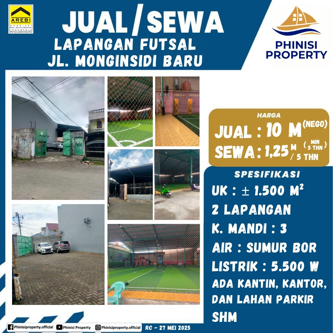 Dijual/Disewakan Lapangan Futsal Jln Monginsidi Makassar - Jalan Monginsidi, Mangkura, Maricaya Baru, Ujung Pandang, Makassar, South Sulawesi, Sulawesi, 90142, Indonesia