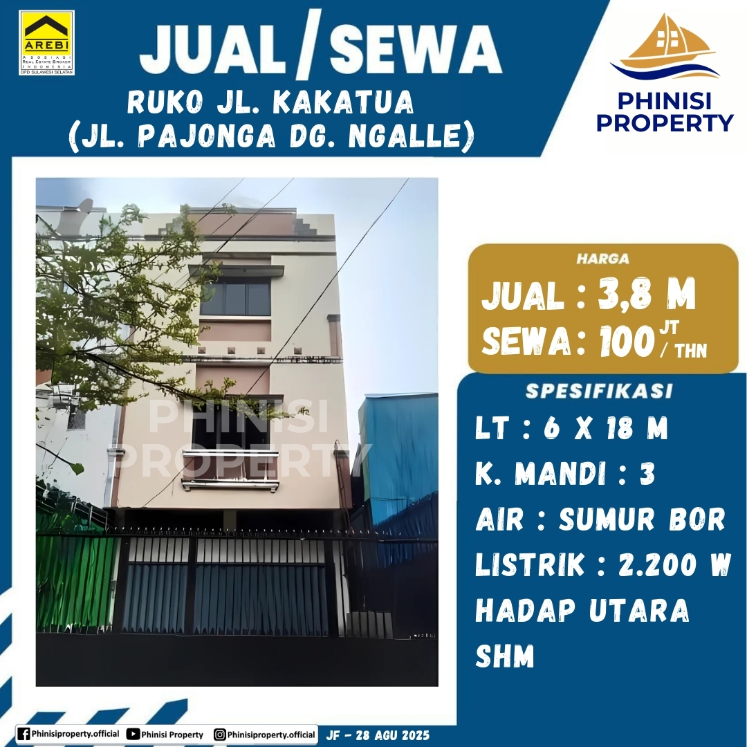 Ditawarkan untuk dijual atau disewakan, ruko tiga lantai ini berlokasi di Jalan Kakaktua (Jalan Pajonga Dg. Ngalle). Properti ini berdiri di atas lahan berukuran 6 m x 18 m, dengan total luas 108 meter persegi. Ruko ini dirancang fungsional, cocok untuk berbagai jenis usaha dan dapat sekaligus menjadi tempat tinggal.