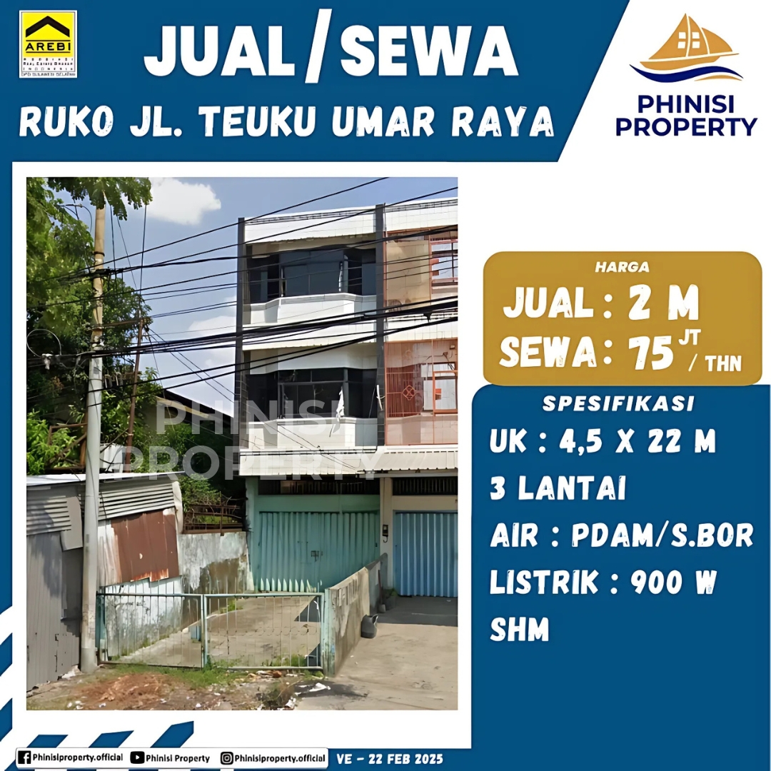 Mencari ruko untuk dijual atau disewa di lokasi komersial utama Makassar? Ruko di Jalan Teuku Umar Raya ini adalah pilihan multifungsi yang tidak boleh Anda lewatkan! Dengan ukuran 4,5 meter×22 meter dan bangunan 3 lantai, ruko ini menawarkan ruang yang efisien dan fleksibel untuk berbagai jenis usaha, mulai dari kantor, toko, hingga gudang.