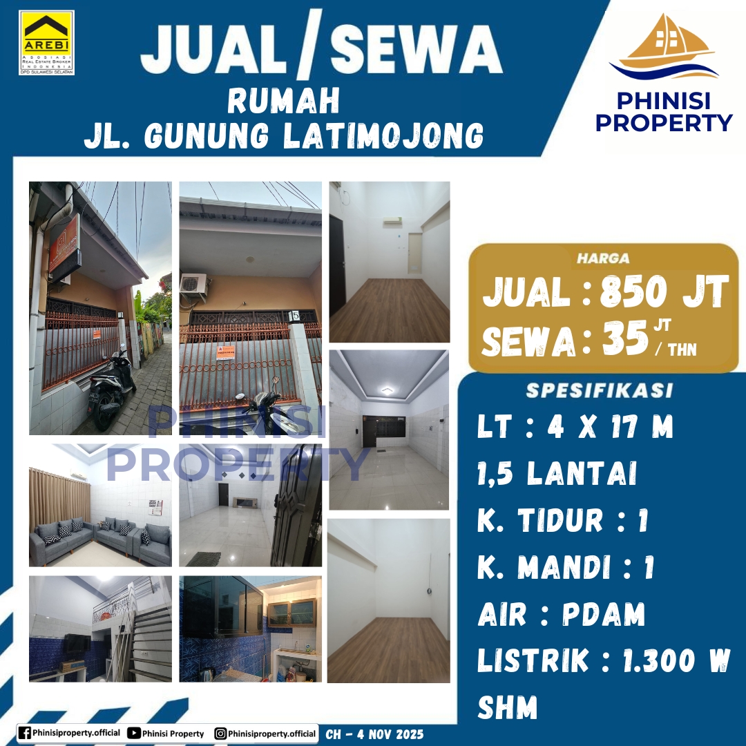 Ditawarkan untuk jual atau sewa, rumah 1,5 lantai yang berlokasi strategis di Jalan Gunung Latimojong, menjadikannya pilihan ideal untuk tempat tinggal dengan akses mudah ke pusat kota. Rumah ini memiliki spesifikasi yang ringkas dan fungsional, dengan luas tanah (LT) $4 \times 17$ meter. Hunian ini dilengkapi dengan 1 kamar tidur dan 1 kamar mandi. Fasilitas dasar tersedia lengkap, didukung oleh sambungan air PDAM dan daya listrik 1.300 Watt. Keunggulan properti ini adalah status legalitasnya yang sudah Sertifikat Hak Milik (SHM), menjamin keamanan dan kenyamanan bagi pembeli maupun penyewa yang mencari properti di lokasi yang strategis dan ramai.