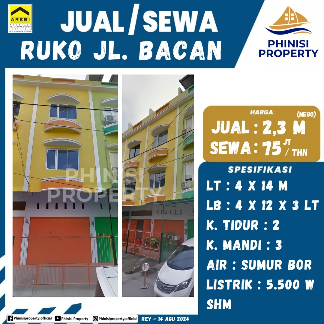 Ruko di Jalan Bacan kini tersedia untuk dijual maupun disewakan, menawarkan lokasi strategis untuk berbagai keperluan bisnis. Dengan luas tanah 4x14 meter dan luas bangunan 4x12 meter yang terdiri dari tiga lantai, ruko ini menyediakan ruang yang ideal dan fungsional. Properti ini memiliki dua kamar tidur dan tiga kamar mandi, dilengkapi dengan air sumur bor dan daya listrik 5.500W. Ruko ini bersertifikat SHM.