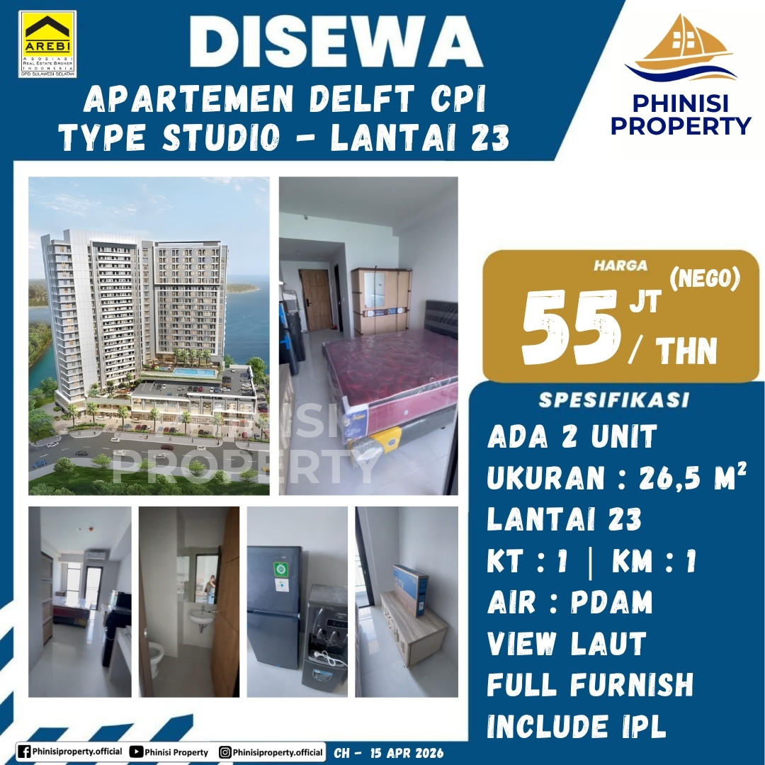 Disewa Apartemen Delft CPI Tipe Studio Lantai 23 Full Furnish Include IPL - Delft Apartment, Centre Point of Indonesia (CPI), Panambungan, Mariso, Makassar, Sulawesi Selatan, Sulawesi, Indonesia