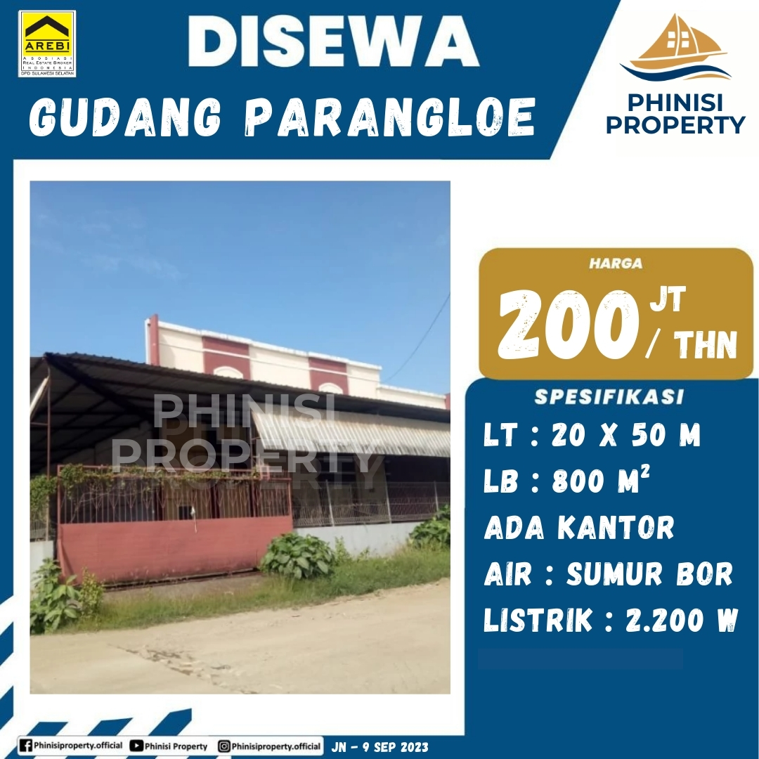 Disewakan sebuah gudang yang berlokasi di Parangloe. Gudang ini memiliki luas tanah 1.000 meter persegi (20 x 50 meter) dan luas bangunan 800 meter persegi. Properti ini sudah dilengkapi dengan kantor, pasokan air dari sumur bor, dan daya listrik 2.200 Watt. Dengan spesifikasi dan ruang yang luas, gudang ini sangat cocok untuk berbagai kebutuhan penyimpanan atau operasional bisnis.