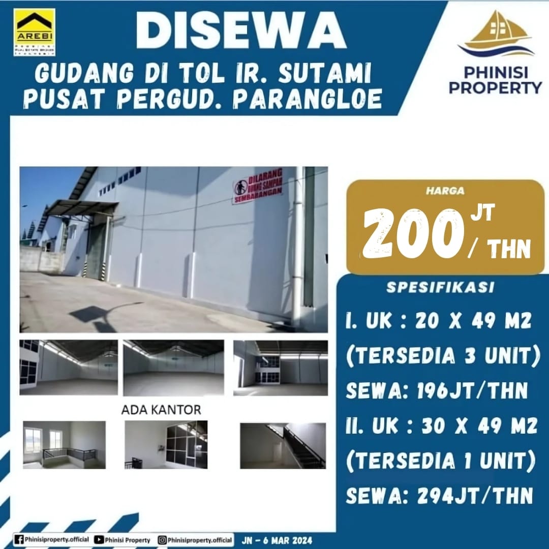 Phinisi Property menawarkan gudang untuk disewakan yang berlokasi strategis di Pusat Pergudangan Parangloe, Tol Ir. Sutami. Gudang ini tersedia dalam dua pilihan ukuran: