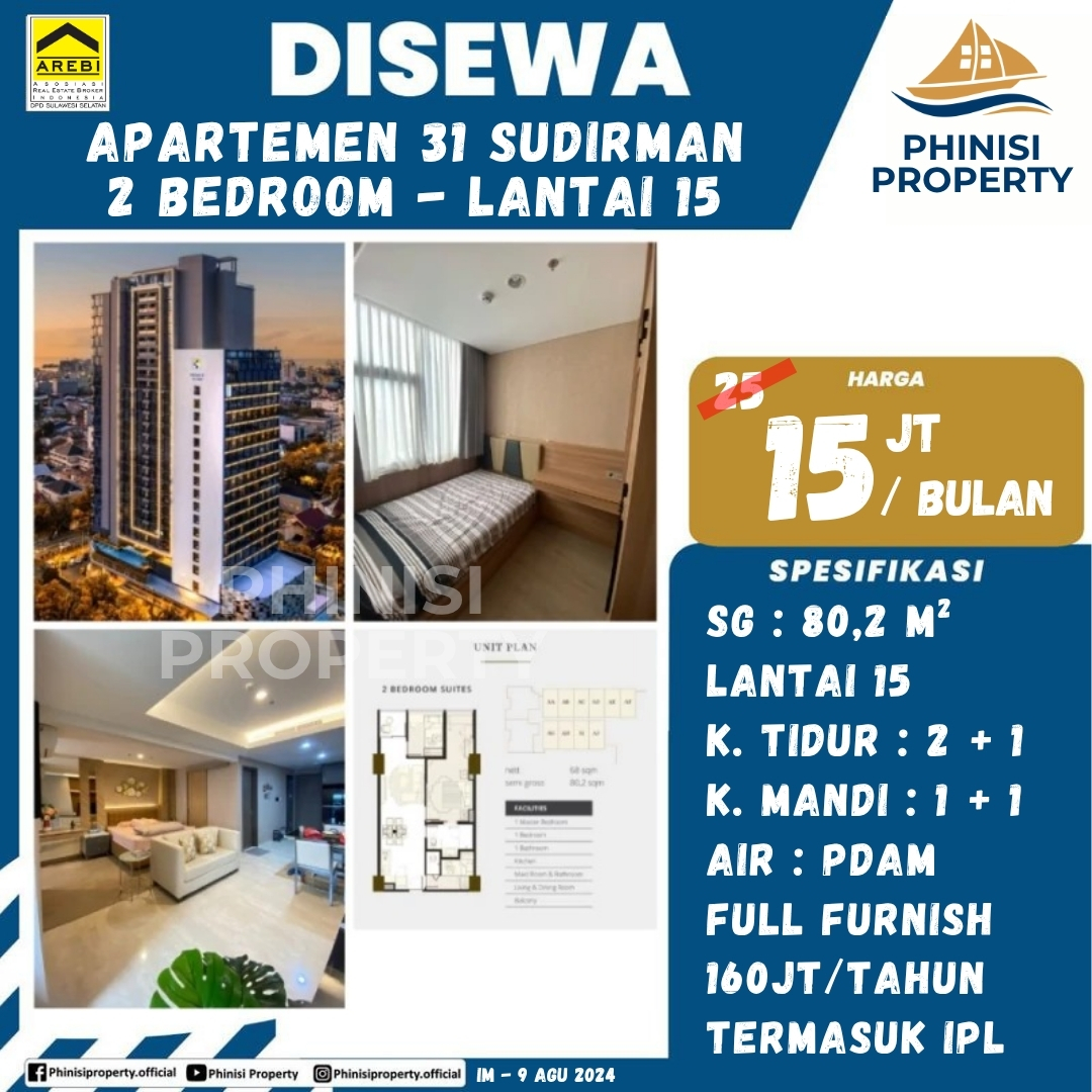 Apartemen di 31 Sudirman ini disewakan dengan unit tipe 2 Bedroom yang modern dan nyaman. Berada di lantai 15, apartemen ini memiliki luas 80,2 meter persegi. Unit ini memiliki 3 kamar tidur (2+1) dan 2 kamar mandi (1+1), menjadikannya ideal untuk keluarga kecil atau profesional. Apartemen ini juga sudah dilengkapi dengan air PDAM dan dijual dalam kondisi full furnish, sehingga penyewa bisa langsung pindah dan tinggal dengan nyaman.