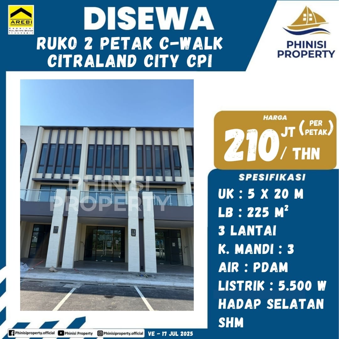 Cari ruko disewakan di lokasi premium Makassar? Ruko 2 petak di CWalk Citraland City CPI adalah pilihan ideal untuk bisnis Anda. Dengan spesifikasi luas tanah 5×20 meter dan luas bangunan 225 meter persegi, ruko 3 lantai ini menawarkan ruang yang lapang dan fleksibel. Dilengkapi dengan 3 kamar mandi, pasokan air PDAM, dan daya listrik 5.500 Watt, properti ini siap menunjang operasional berbagai jenis usaha. Lokasinya yang strategis di Citraland City CPI, salah satu area paling berkembang di Makassar, menjamin visibilitas tinggi dan akses mudah bagi pelanggan. Ruko menghadap selatan ini memiliki Sertifikat Hak Milik (SHM) dan disewakan dengan harga kompetitif 210 juta per petak per tahun. Jangan lewatkan kesempatan emas ini untuk mengembangkan bisnis Anda di kawasan bergengsi Citraland City CPI.