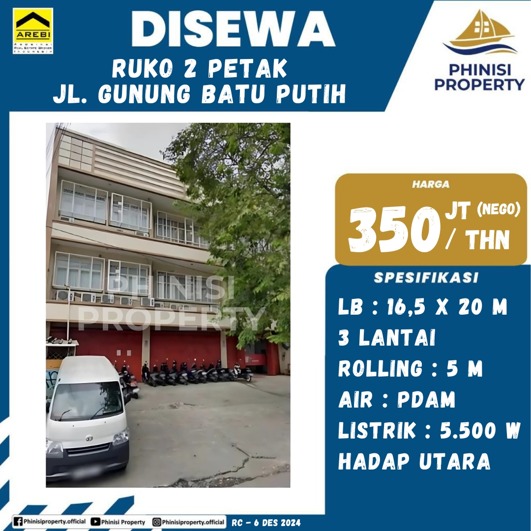 Disewakan ruko tiga petak di lokasi strategis Jalan Gunung Batu Putih, properti komersial yang sangat cocok untuk berbagai jenis usaha. Ruko ini memiliki luas bangunan 330 meter persegi yang merupakan hasil dari perkalian 16,5 meter dan 20 meter. Dengan tiga lantai, ruko ini menawarkan ruang yang luas dan fleksibel untuk operasional bisnis Anda. Dilengkapi dengan fasilitas air PDAM dan listrik 5.500 watt, ruko ini siap untuk langsung digunakan. Selain itu, pintu rollingnya memiliki tinggi 5 meter, yang memudahkan akses untuk kendaraan besar. Dengan lokasi yang mudah dijangkau dan spesifikasi yang memadai, ruko ini menjadi pilihan yang tepat untuk mengembangkan bisnis Anda di area yang prospektif.
