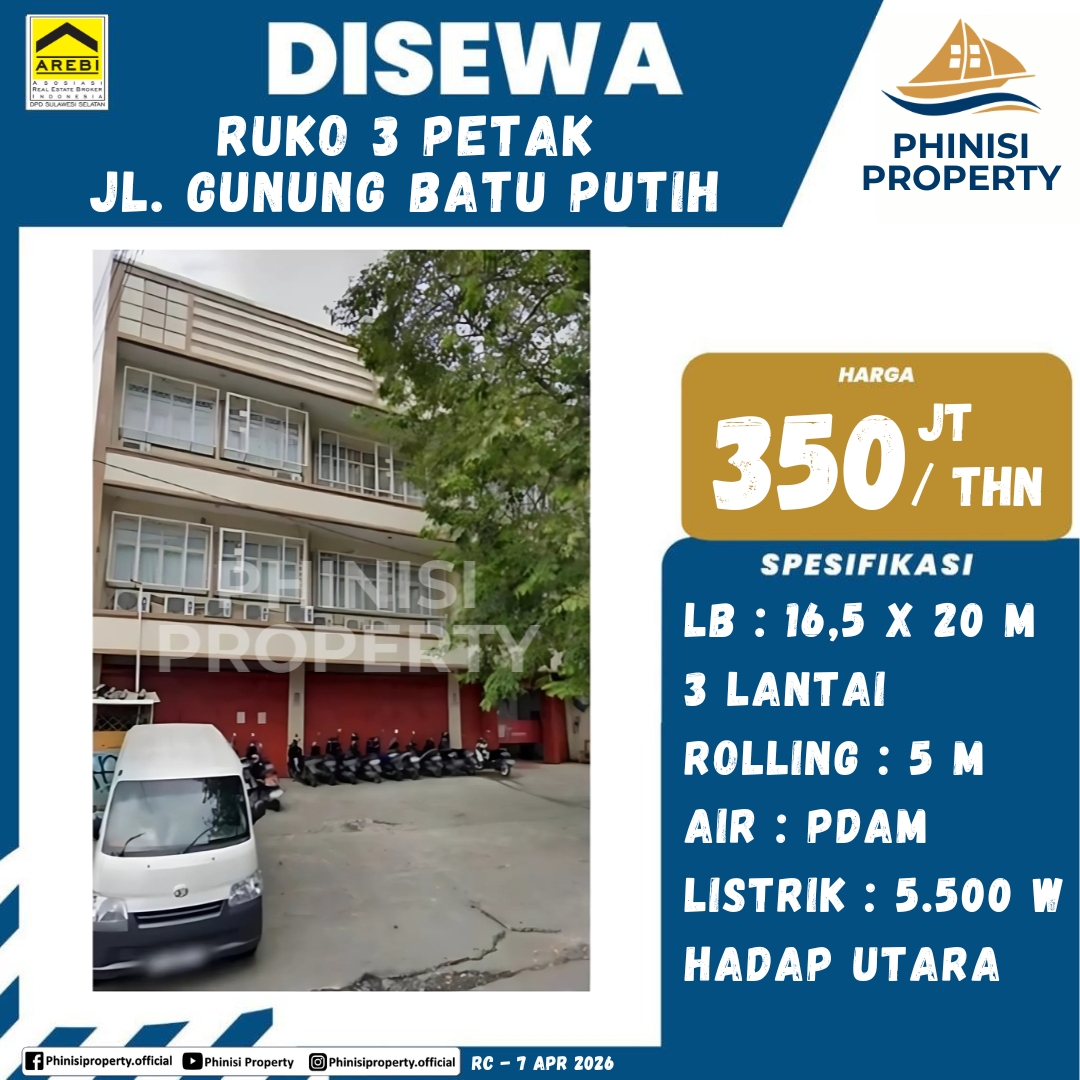 Disewa Ruko 3 Petak Jl. Gunung Batu Putih - Jalan G. Batu Putih, Mangkura, Maricaya Baru, Ujung Pandang, Makassar, South Sulawesi, Sulawesi, 90142, Indonesia