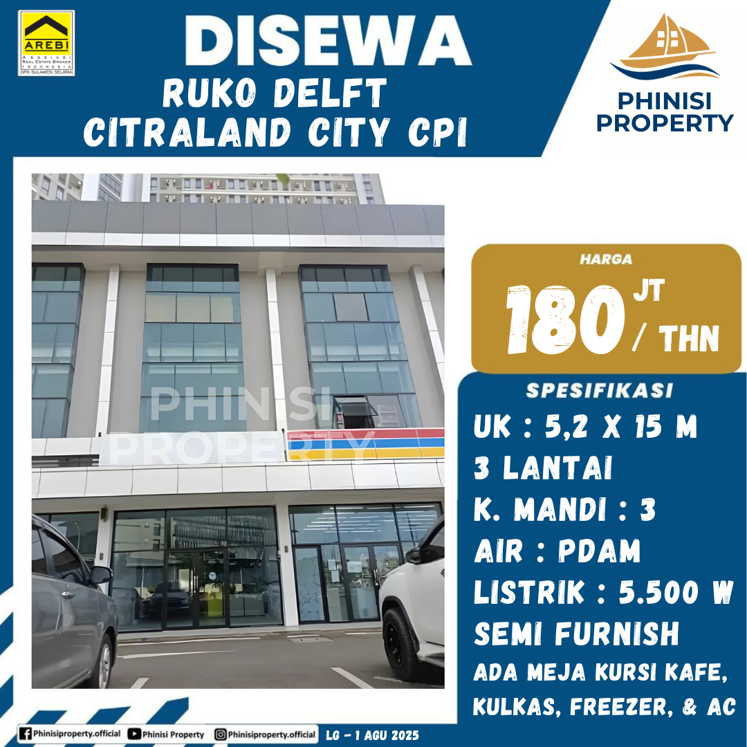 Disewakan sebuah ruko semi furnish yang terletak di Ruko Delft, kawasan elit Citraland City CPI. Ruko tiga lantai ini memiliki luas tanah 78 meter persegi, hasil dari perkalian 5,2 meter kali 15 meter. Dilengkapi dengan tiga kamar mandi, ruko ini sudah terpasang fasilitas air PDAM dan memiliki daya listrik 5.500 watt. Properti ini sangat cocok untuk usaha kuliner karena sudah dilengkapi dengan meja, kursi kafe, kulkas, dan freezer. Dengan lokasinya yang strategis di kawasan bisnis yang sedang berkembang, ruko ini menjadi pilihan tepat untuk memulai atau mengembangkan bisnis Anda.