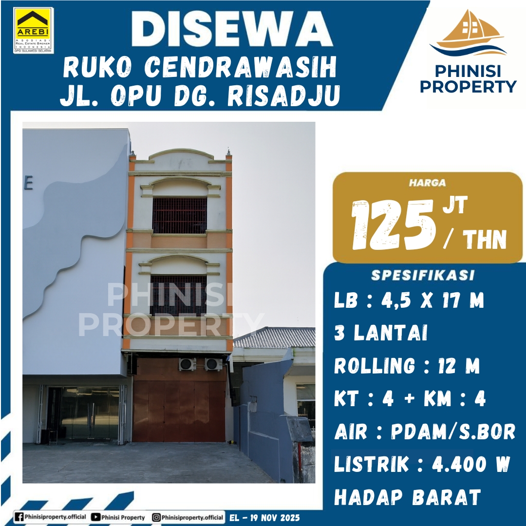 Kembangkan bisnis Anda di lokasi yang sangat strategis dan ramai dengan menyewa ruko tiga lantai yang terletak di jalan utama Cendrawasih atau Jalan Opu Dg. Risadju. Properti komersial ini memiliki dimensi bangunan 4,5 x 17 meter dan keunggulan area rolling atau pelataran depan sepanjang 12 meter yang sangat luas untuk parkir pelanggan. Fasilitas interiornya dirancang untuk mendukung operasional bisnis yang maksimal, meliputi 4 ruangan yang bisa dijadikan kantor atau kamar, 4 kamar mandi, serta dukungan daya listrik besar 4.400 Watt dan sumber air ganda (PDAM serta sumur bor). Dengan posisi menghadap Barat yang memberikan visibilitas tinggi, ruko ini adalah pilihan tepat untuk perkantoran, usaha kuliner, maupun retail.