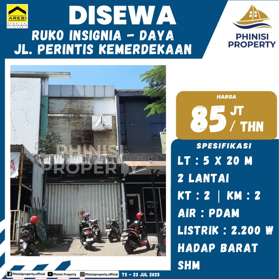 Ruko yang disewakan di Ruko Insignia - Daya, Jl. Perintis Kemerdekaan, ini adalah pilihan yang sangat strategis untuk bisnis Anda. Dengan luas tanah (LT) 5 meter x 20 meter, properti ini memiliki total 100 m². Bangunan dua lantai ini dilengkapi dengan 2 kamar tidur dan 2 kamar mandi, menjadikannya sangat fungsional untuk kantor, tempat usaha, atau kombinasi keduanya. Ruko ini memiliki pasokan air dari PDAM dan daya listrik sebesar 2.200 watt. Menghadap ke barat, properti ini mendapatkan pencahayaan sore hari yang optimal dan memiliki legalitas Sertifikat Hak Milik (SHM), yang menjamin keamanan bagi penyewa. Dengan lokasinya yang ramai dan mudah diakses, ruko ini siap mendukung kelancaran bisnis Anda.