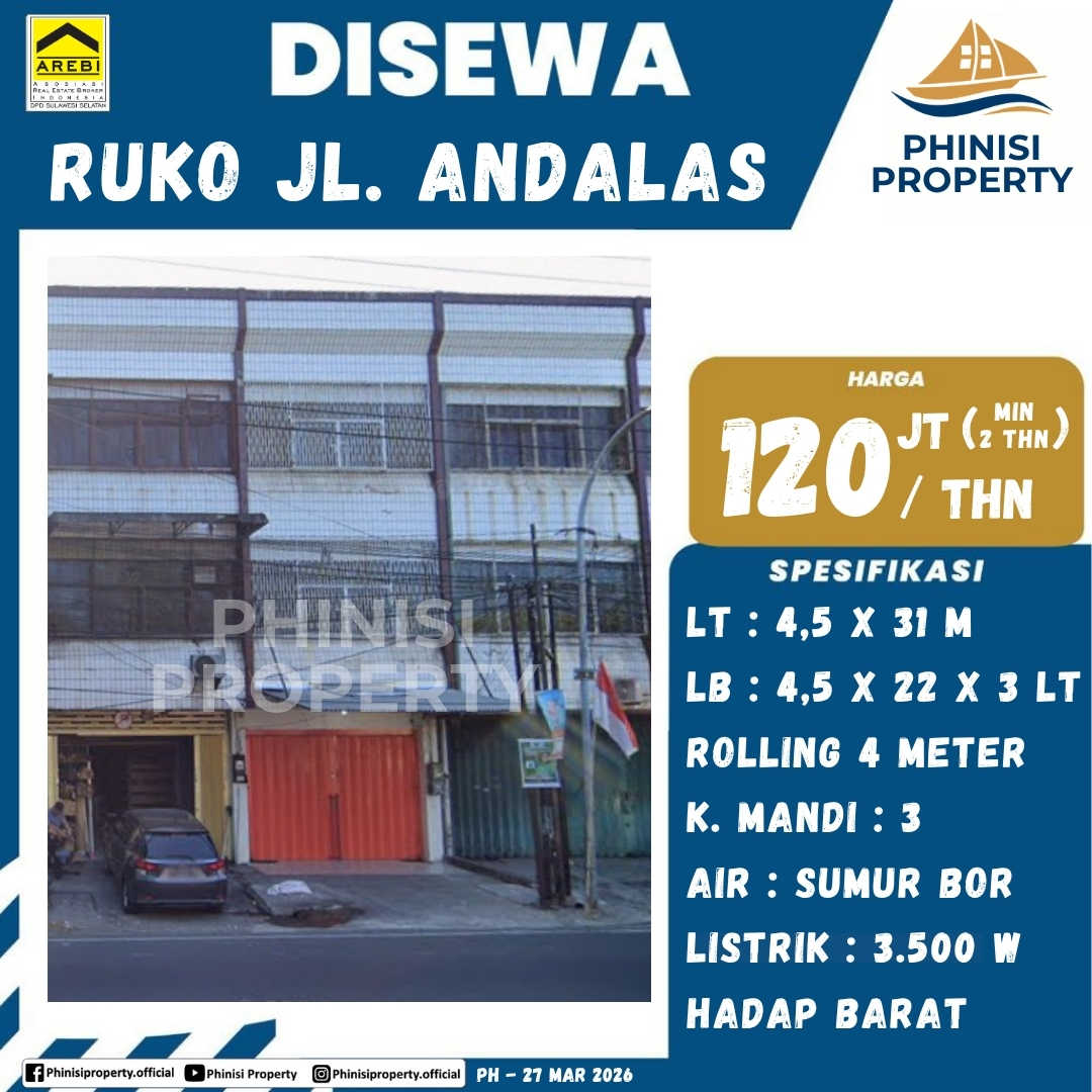Disewa Ruko Jl. Andalas - Jalan Andalas, Bontoala Tua, Bontoala, Makassar, Sulawesi Selatan, Sulawesi, 90156, Indonesia