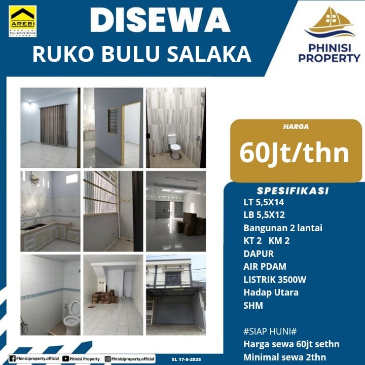Ruko dua lantai di Bulu Salaka ini disewakan dengan kondisi siap huni, cocok untuk usaha maupun tempat tinggal. Properti ini memiliki luas tanah 5,5 x 14 meter atau 77 m² dan luas bangunan 5,5 x 12 meter atau 66 m², dengan 2 kamar tidur dan 2 kamar mandi (KM 2). Dilengkapi dengan fasilitas air PDAM dan daya listrik 3.500W, serta legalitas Sertifikat Hak Milik (SHM). Ruko ini menghadap ke Utara dan menawarkan kenyamanan serta lokasi strategis.