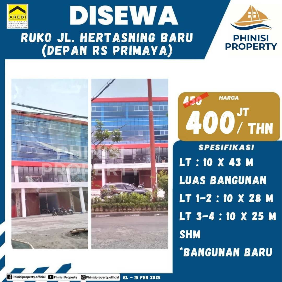 Ruko disewakan di Jalan Hertasning Baru, tepat di depan Rumah Sakit Primaya, ini adalah pilihan yang sangat strategis untuk bisnis. Ruko ini memiliki luas tanah 10 x 43 meter atau 430 m² dengan luas bangunan yang sangat luas: lantai 1-2 berukuran 10 x 28 meter dan lantai 3-4 berukuran 10 x 25 meter, total luas bangunan 530 m². Ruko ini adalah bangunan baru dengan legalitas Sertifikat Hak Milik (SHM), memberikan rasa aman dalam bertransaksi. Lokasinya yang sangat ramai dan mudah dijangkau membuatnya ideal untuk berbagai jenis usaha.