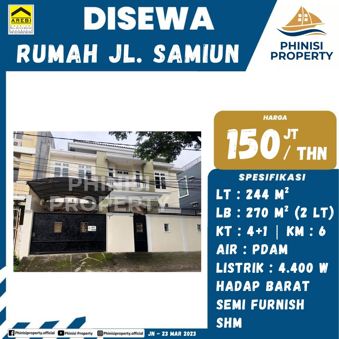 Tersedia untuk disewa sebuah rumah di Jalan Samiun. Rumah ini memiliki luas tanah 244 meter persegi dan luas bangunan 270 meter persegi, terdiri dari 2 lantai. Properti ini dilengkapi dengan 4 kamar tidur utama dan 1 kamar tidur tambahan, serta 6 kamar mandi. Rumah ini sudah dilengkapi dengan pasokan air PDAM dan daya listrik sebesar 4.400 Watt. Berhadapan ke arah barat, rumah ini disewakan dalam kondisi semi-furnish dan memiliki status kepemilikan Sertifikat Hak Milik (SHM).
