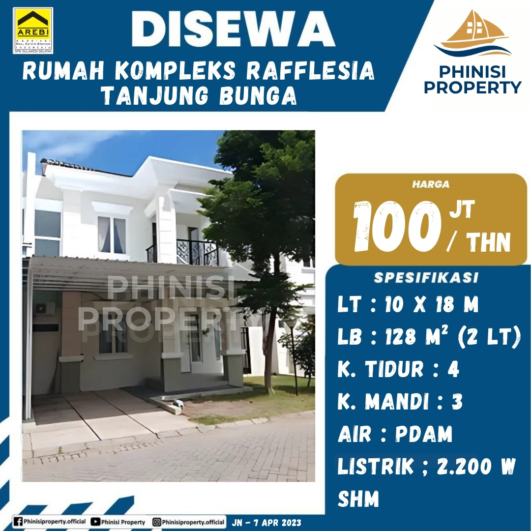 Disewakan sebuah rumah di kawasan perumahan elit Raflesia, Tanjung Bunga. Rumah 2 lantai ini memiliki luas tanah 180 meter persegi (10 x 18 meter) dan luas bangunan 128 meter persegi. Dengan 4 kamar tidur dan 3 kamar mandi, properti ini ideal untuk keluarga. Lokasinya yang berada di lingkungan yang nyaman dan strategis menjadikannya pilihan hunian yang sangat menarik.