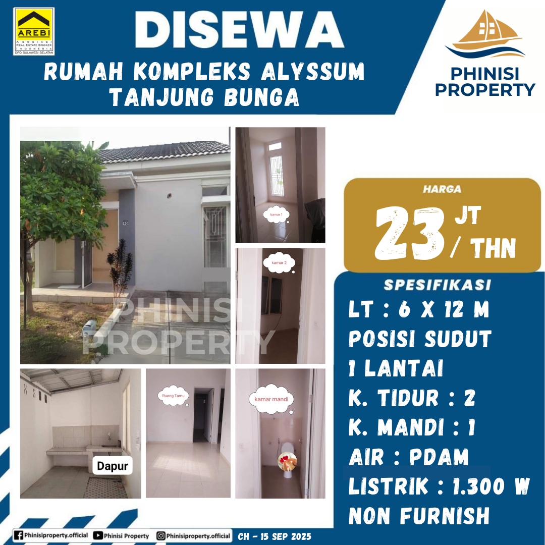 Rumah di Kompleks Alyssum, Tanjung Bunga, ini adalah pilihan sewa yang ideal untuk individu atau keluarga kecil. Properti ini memiliki luas tanah (LT) 6 meter x 12 meter, setara dengan 72 m². Sebagai rumah posisi sudut, properti satu lantai ini memiliki akses dan pencahayaan yang lebih baik. Rumah ini dilengkapi dengan 2 kamar tidur dan 1 kamar mandi. Pasokan air didukung oleh PDAM dan daya listrik sebesar 1.300 watt. Disewakan dalam kondisi non furnish, rumah ini memberikan kebebasan bagi penyewa untuk menata interior sesuai selera. Dengan lokasinya yang nyaman, properti ini adalah pilihan yang praktis dan terjangkau.