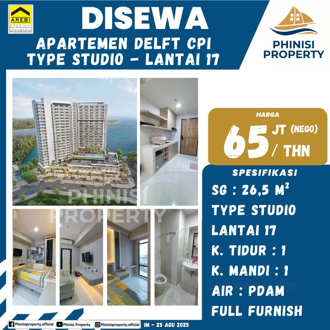 Disewakan apartemen tipe studio di Apartemen Delft Center Point of Indonesia (CPI), Makassar. Apartemen ini berada di lantai 17 dan memiliki luas gross 26,5 meter persegi.