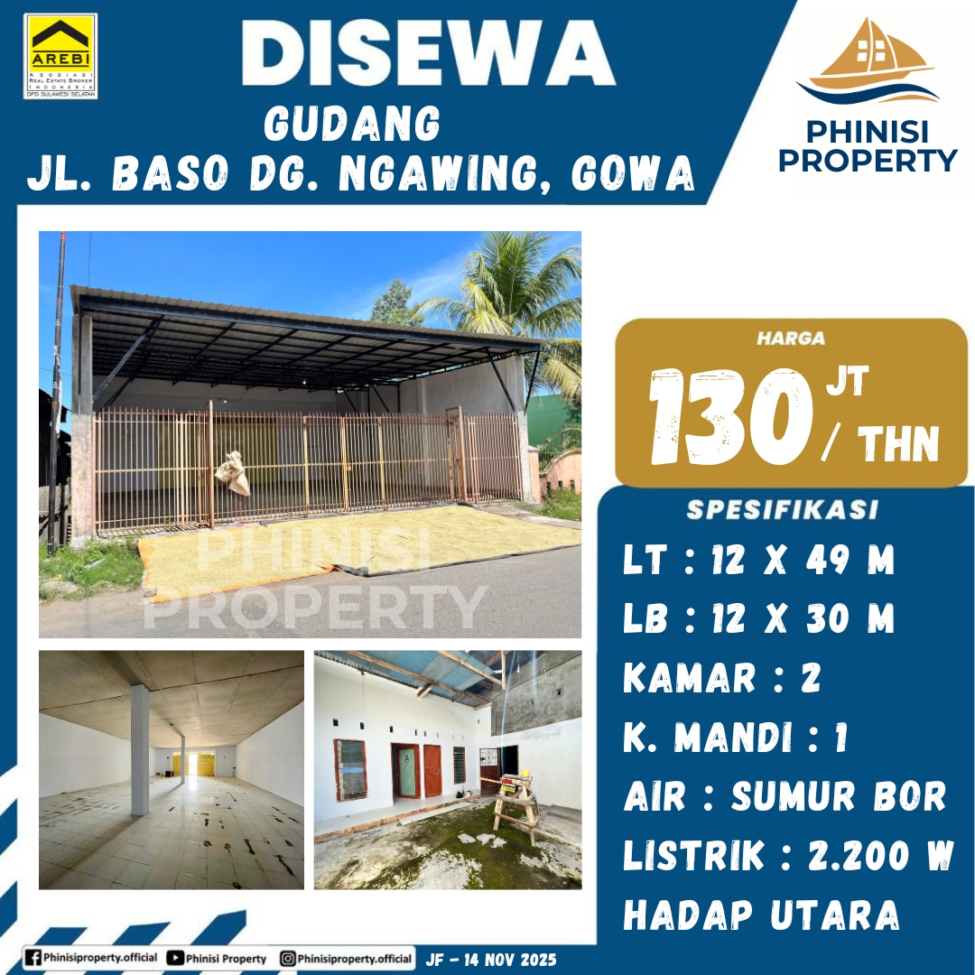 Tersedia untuk disewakan, Gudang dengan area luas yang berlokasi strategis di Jalan Baso Dg. Ngawing, Gowa, sangat cocok untuk kebutuhan penyimpanan atau distribusi skala menengah. Gudang ini menawarkan Luas Tanah 12 x 49 meter, dengan Luas Bangunan 12 x 30 meter, memberikan banyak ruang untuk operasional dan manuver kendaraan. Keunggulan properti ini adalah adanya ruang yang dapat difungsikan sebagai tempat tinggal atau kantor kecil, terdiri dari 2 Kamar dan 1 Kamar Mandi. Fasilitas pendukung meliputi pasokan air Sumur Bor dan daya listrik 2.200 Watt. Gudang ini menghadap Utara, menawarkan akses mudah dan efisien ke jalan raya utama, mendukung kelancaran kegiatan logistik dan bisnis Anda di area Gowa yang terus berkembang.