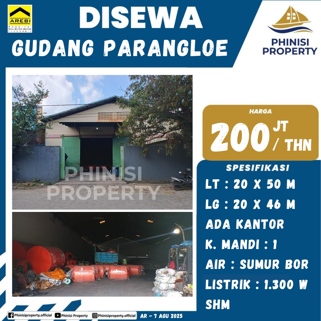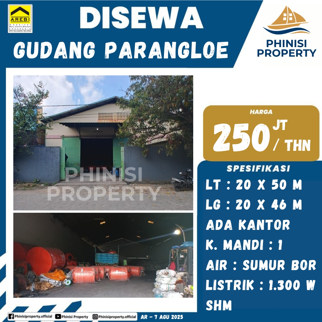 Disewakan gudang di Parangloe, Makassar, yang ideal untuk berbagai keperluan penyimpanan atau produksi. Gudang ini memiliki luas lahan 20 meter x 50 meter, atau total 1.000 meter persegi, dan luas gudang 20 meter x 46 meter, atau total 920 meter persegi.