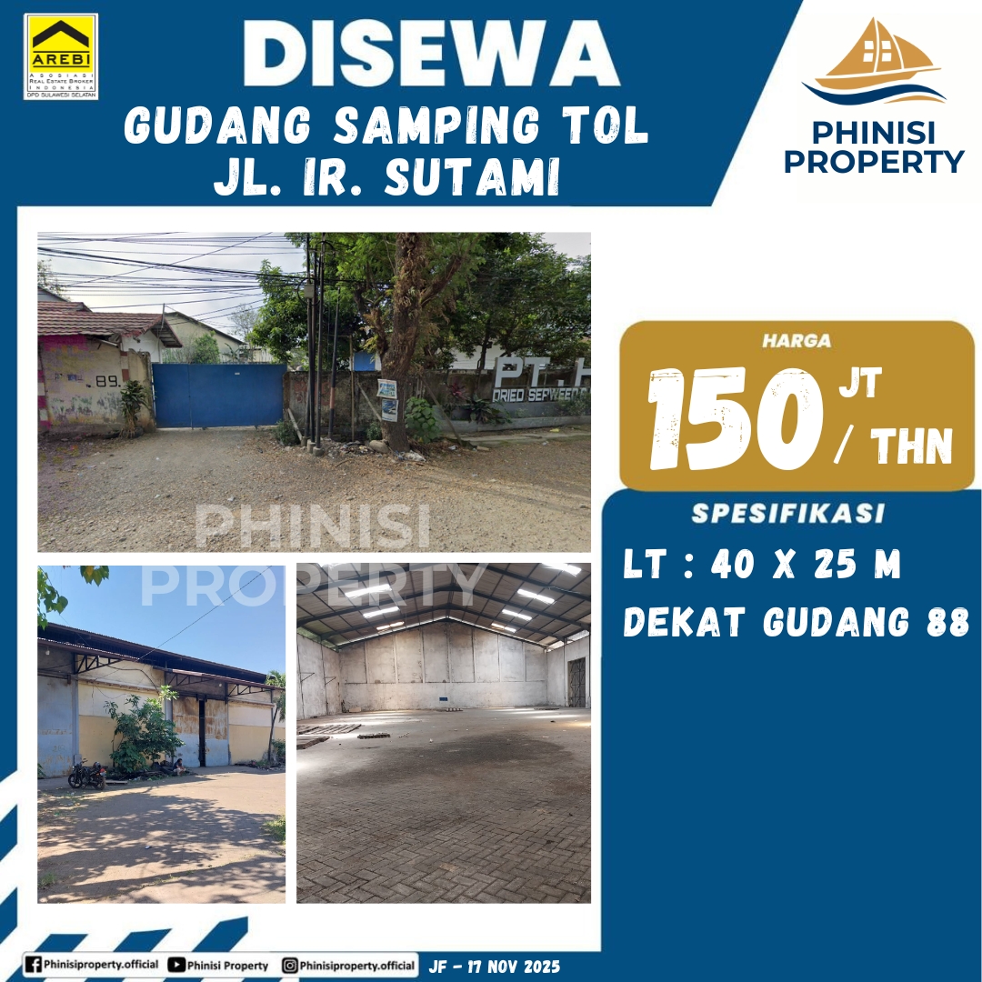 Tersedia untuk disewakan, Gudang Logistik berukuran besar yang berlokasi sangat strategis di Samping Jalan Tol Ir. Sutami, menjadikannya pilihan utama untuk kebutuhan distribusi dan logistik yang efisien. Gudang ini menawarkan Luas Tanah 40 x 25 meter (total 1.000 M²), memberikan ruang yang masif untuk operasional dan penyimpanan. Lokasinya yang dekat dengan Gudang 88 mengindikasikan lingkungan pergudangan yang sudah terbentuk dan kondusif. Keunggulan lokasi di samping tol memastikan aksesibilitas mudah dan cepat untuk transportasi barang, sangat ideal untuk pusat distribusi, depo, atau workshop berskala besar. Segera amankan lokasi ini untuk kelancaran rantai pasok bisnis Anda.
