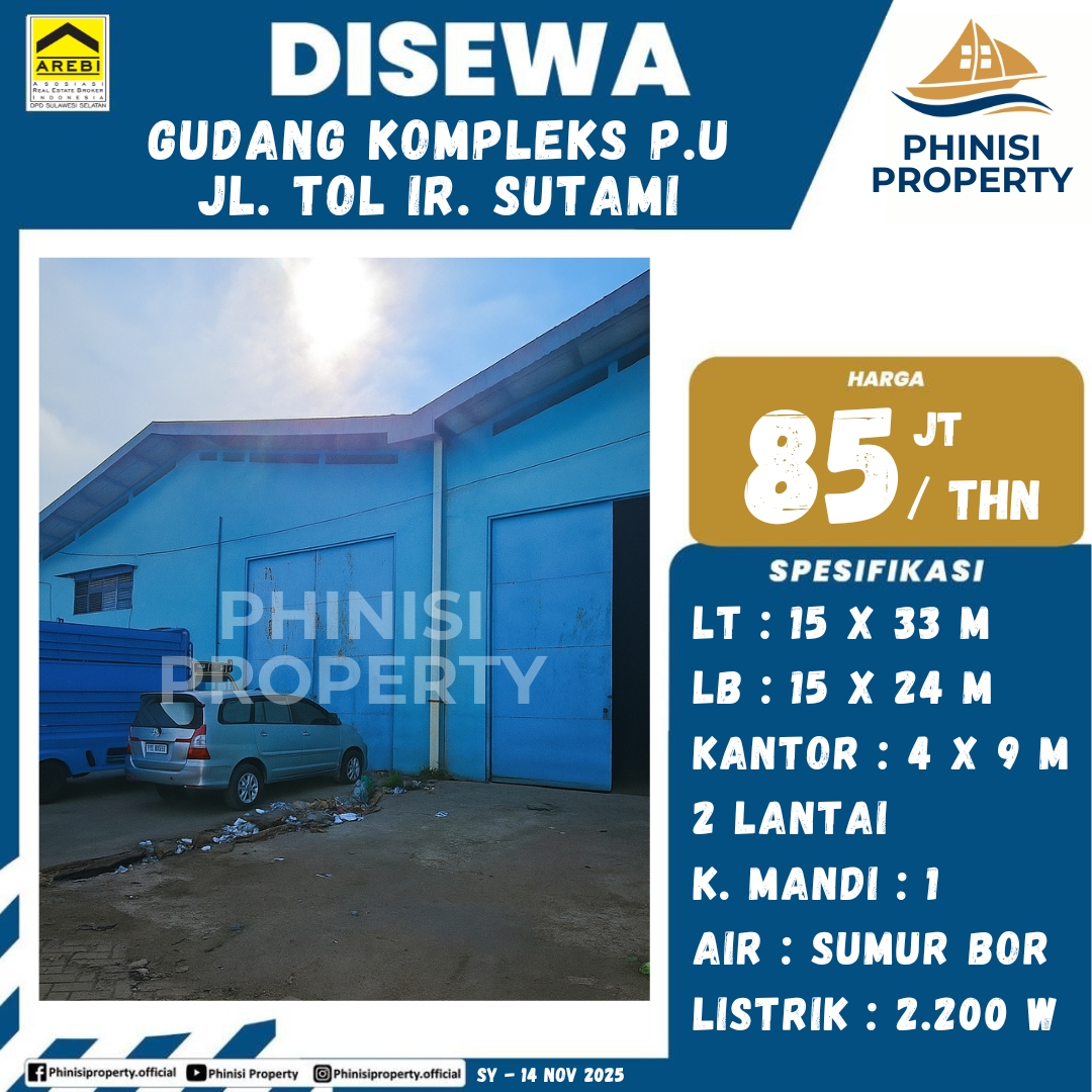 Tersedia untuk disewakan, Gudang Industri yang berlokasi sangat strategis di Kompleks P.U. Jalan Tol Ir. Sutami, menjadikannya pilihan utama untuk kebutuhan logistik dan distribusi yang efisien. Lokasi ini memberikan akses cepat dan mudah ke jalan tol, sangat ideal untuk operasional bisnis skala menengah hingga besar. Gudang ini memiliki Luas Tanah 15 x 33 meter dan Luas Bangunan 15 x 24 meter. Dilengkapi dengan fasilitas pendukung berupa Kantor 2 Lantai berukuran 4 x 9 meter, yang menyediakan ruang kerja yang memadai. Gudang ini memiliki 1 Kamar Mandi, didukung pasokan air Sumur Bor dan daya listrik 2.200 Watt. Keberadaan di kawasan Kompleks P.U. dekat Tol Ir. Sutami menjamin lingkungan bisnis yang kondusif dan efisien.