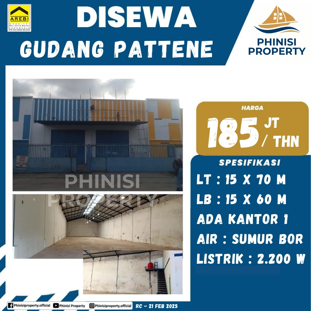 Disewakan gudang di daerah Pattene, sebuah properti yang ideal untuk menunjang operasional bisnis Anda. Gudang ini memiliki luas tanah 1.050 meter persegi, hasil dari perkalian 15 meter dan 70 meter. Dengan luas gudang 900 meter persegi, yang didapat dari perkalian 15 meter dan 60 meter, properti ini menawarkan ruang penyimpanan yang sangat luas. Gudang ini juga dilengkapi dengan satu kantor, menambah fleksibilitas penggunaan. Fasilitas pendukung lainnya termasuk air sumur bor dan listrik 2.200 watt. Lokasi yang strategis menjadikan gudang ini pilihan yang sangat efisien untuk kegiatan logistik dan distribusi