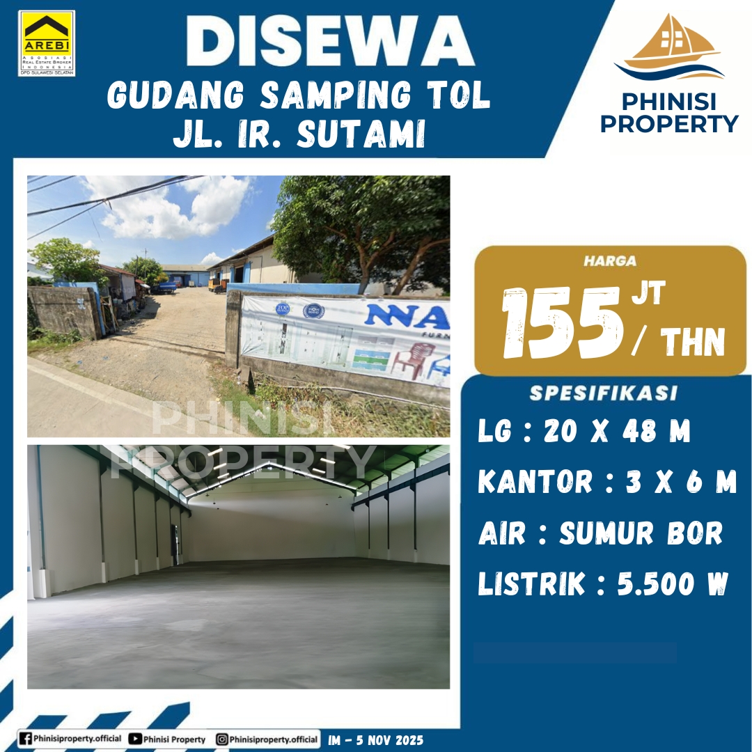 Sewa gudang di lokasi premium, Jalan Ir. Sutami, yang menawarkan akses mudah langsung di samping jalan tol, adalah pilihan investasi cerdas untuk operasional bisnis Anda. Gudang seluas 20×48 meter ini dilengkapi dengan kantor berukuran 3×6 meter dan fasilitas pendukung vital seperti air sumur bor dan daya listrik 5.500 Watt, menjadikannya ideal untuk distribusi, penyimpanan, atau workshop skala besar yang memerlukan mobilitas tinggi dan infrastruktur memadai di kawasan industri Makassar.