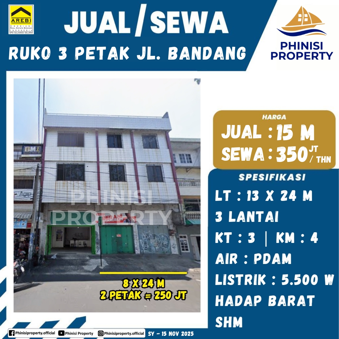 Tersedia untuk dijual dan disewakan, Ruko 3 Petak yang berlokasi sangat strategis dan komersial di Jalan Bandang. Properti ini sangat ideal untuk perkantoran, pusat distribusi, atau usaha ritel besar, mengingat lokasinya yang berada di kawasan ramai. Ruko ini memiliki Luas Tanah 13 x 24 meter dan terdiri dari 3 Lantai, menawarkan ruang yang masif dan fleksibel untuk berbagai kebutuhan bisnis. Fasilitas kamar sangat lengkap dengan total 3 Kamar Tidur dan 4 Kamar Mandi. Operasional bisnis didukung penuh dengan daya listrik besar 5.500 Watt dan pasokan air PDAM. Ruko ini menghadap Barat dan memiliki legalitas terjamin dengan sertifikat SHM (Sertifikat Hak Milik). Terdapat juga opsi sewa 2 Petak (8x24 meter) untuk fleksibilitas lebih bagi penyewa.