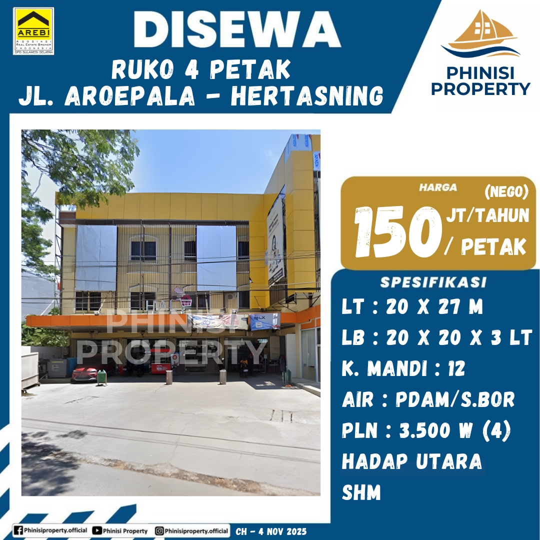 Sewa properti komersial premium yang strategis, yaitu Ruko 4 Petak di Jalan Aroepala - Hertasning, lokasi yang dikenal sebagai pusat bisnis dengan traffic tinggi. Ruko ini ditawarkan secara keseluruhan dan sangat cocok untuk kantor pusat, klinik, showroom, atau pusat pelatihan, dengan spesifikasi yang sangat mumpuni. Bangunan terdiri dari 3 Lantai dan memiliki dimensi besar Luas Bangunan 20 x 20 meter, berdiri di atas Luas Tanah 20 x 27 meter. Fasilitas sangat lengkap dengan total 12 Kamar Mandi yang terdistribusi di setiap lantai/petak. Ruko ini disokong oleh listrik berkapasitas total 4 x 3.500 Watt (untuk 4 petak) dan pasokan air dari PDAM/Sumur Bor, menghadap Utara. Legalitas terjamin dengan sertifikat SHM (Sertifikat Hak Milik), menawarkan kepastian dan stabilitas bisnis Anda di area komersial yang premium.