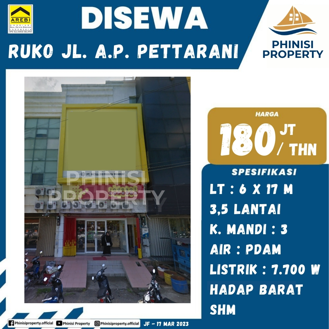Sebuah ruko di Jalan A.P. Pettarani kini tersedia untuk disewakan. Ruko ini memiliki 3,5 lantai dengan luas tanah 102 meter persegi (6 x 17 meter). Properti ini dilengkapi dengan tiga kamar mandi, daya listrik 7.700 watt, dan pasokan air PDAM. Menghadap ke arah barat, ruko ini sudah bersertifikat Hak Milik (SHM), menjadikannya pilihan ideal untuk berbagai jenis usaha.