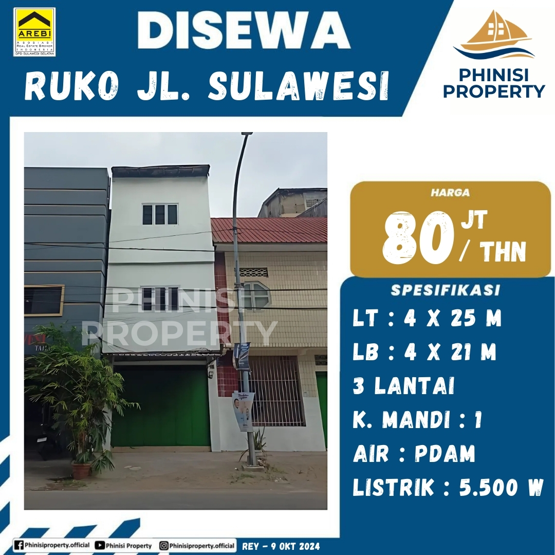 Ruko yang berlokasi strategis di Jalan Sulawesi kini tersedia untuk disewakan, ideal untuk berbagai jenis usaha. Dengan luas tanah 4x25 meter dan luas bangunan 4x21 meter yang terdiri dari tiga lantai, ruko ini menyediakan ruang yang luas dan fungsional. Properti ini memiliki satu kamar mandi, didukung dengan pasokan air PDAM dan daya listrik 5.500W. Lokasi yang strategis di kawasan bisnis menjanjikan visibilitas dan akses yang baik. Ruko ini sangat cocok untuk Anda yang mencari tempat usaha di lokasi ramai.