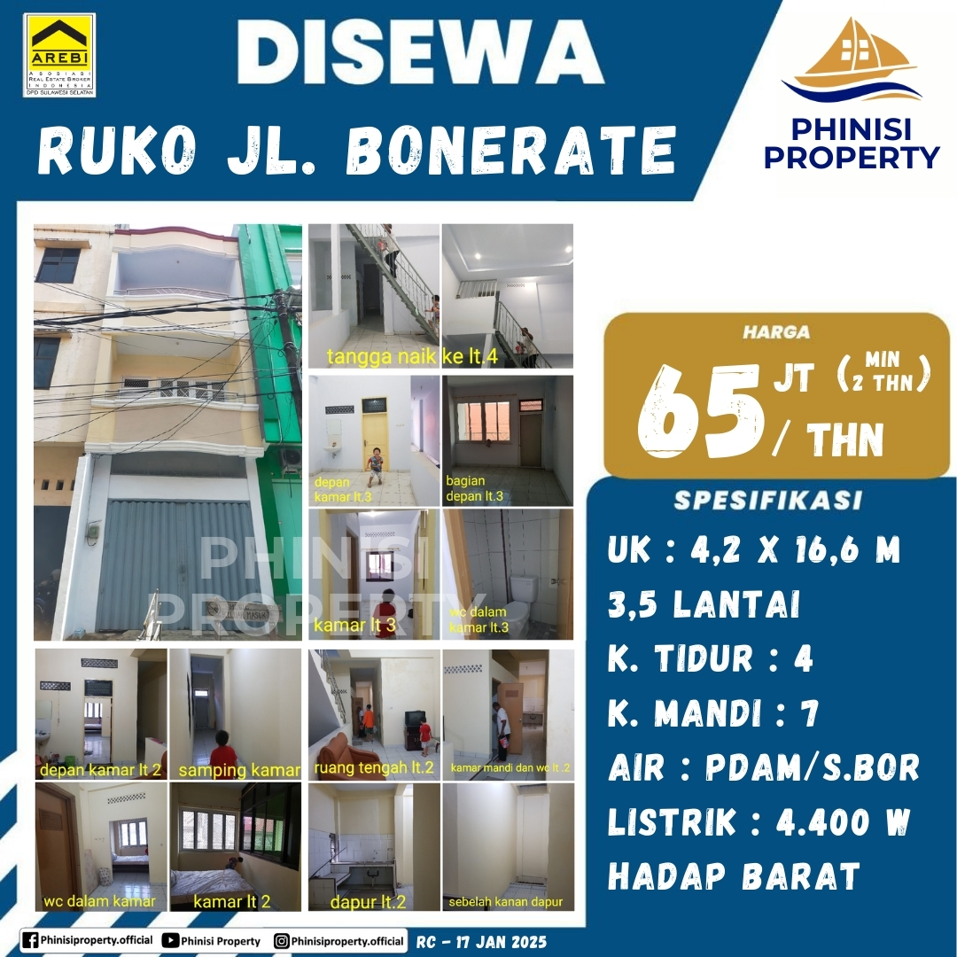 Disewakan ruko serbaguna di lokasi strategis, Jalan Bonerate, yang ideal untuk berbagai kebutuhan usaha atau bahkan hunian. Ruko ini memiliki luas 69,72 meter persegi, hasil dari perkalian 4,2 meter dan 16,6 meter. Properti ini terdiri dari 3,5 lantai yang mencakup 4 kamar tidur dan 7 kamar mandi, menjadikannya sangat fleksibel untuk penggunaan bisnis atau residensial. Ruko ini juga dilengkapi dengan fasilitas air PDAM dan sumur bor, serta listrik 4.400 watt. Menghadap ke Barat, properti ini menawarkan lokasi yang mudah dijangkau dan siap untuk langsung digunakan.