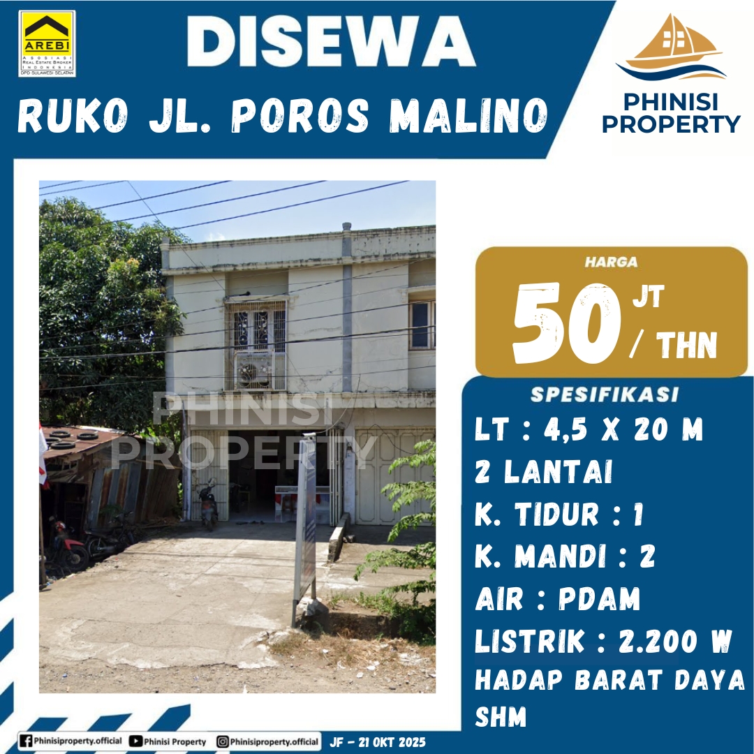 Disewakan ruko dua lantai (2 LT) yang berlokasi sangat strategis di Jalan Poros Malino, menjadikannya pilihan ideal untuk kantor, toko, atau bisnis lainnya. Ruko ini memiliki dimensi yang proporsional untuk kegiatan komersial, dengan luas tanah (LT) 4,5 x 20 meter. Properti ini difasilitasi dengan 1 kamar tidur (yang bisa dialihfungsikan sebagai ruang kantor/gudang) dan 2 kamar mandi. Keunggulan fasilitas didukung oleh air PDAM dan daya listrik 2.200 Watt. Ruko ini menghadap Barat Daya dan berstatus Sertifikat Hak Milik (SHM), memberikan kepastian hukum bagi penyewa jangka panjang. Lokasinya yang berada di jalan utama (Poros) menjamin visibilitas dan akses pelanggan yang tinggi.