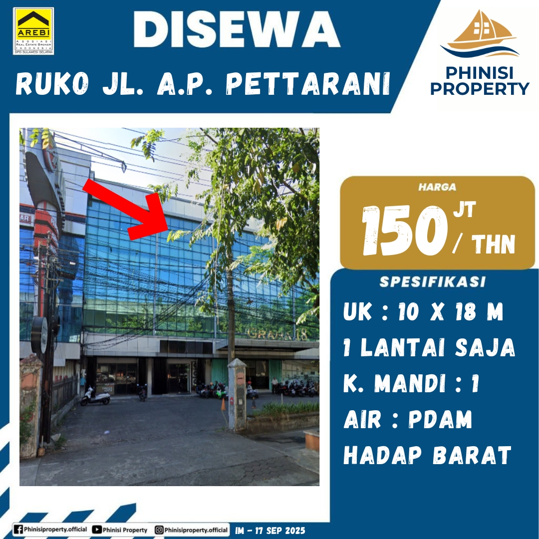 Disewakan ruko dengan lokasi sangat strategis di Jalan A.P. Pettarani, salah satu jalan utama di Makassar. Ruko ini memiliki luas 180 meter persegi, hasil dari ukuran 10 meter kali 18 meter, dan hanya tersedia untuk satu lantai saja. Properti ini dilengkapi dengan satu kamar mandi dan pasokan air PDAM, serta memiliki posisi hadap barat yang ideal. Dengan lokasinya yang berada di area komersial yang ramai, ruko ini sangat cocok untuk berbagai jenis usaha yang ingin menjangkau banyak pelanggan.