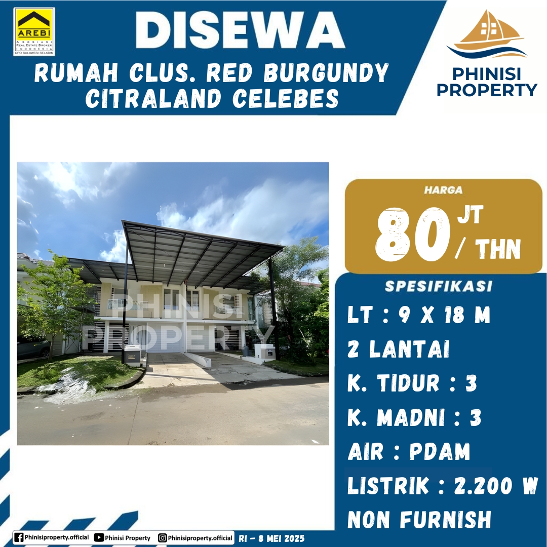 Disewakan rumah dua lantai di Cluster Red Burgundy, Citraland Celebes, yang menawarkan hunian mewah dengan lingkungan yang nyaman. Rumah ini memiliki ukuran 9 x 18 meter atau total 162 m², dengan tata ruang yang fungsional terdiri dari 3 kamar tidur dan 3 kamar mandi. Dilengkapi dengan air PDAM dan daya listrik 2.200 watt, rumah ini siap untuk disewa dalam kondisi non-furnish, memberikan Anda kebebasan untuk mendekorasi sesuai selera. Lokasi yang strategis di kawasan prestisius ini adalah pilihan ideal untuk keluarga yang mencari kenyamanan dan keamanan.