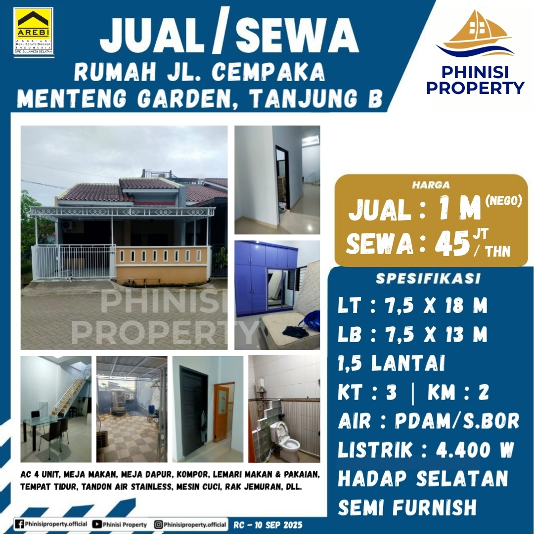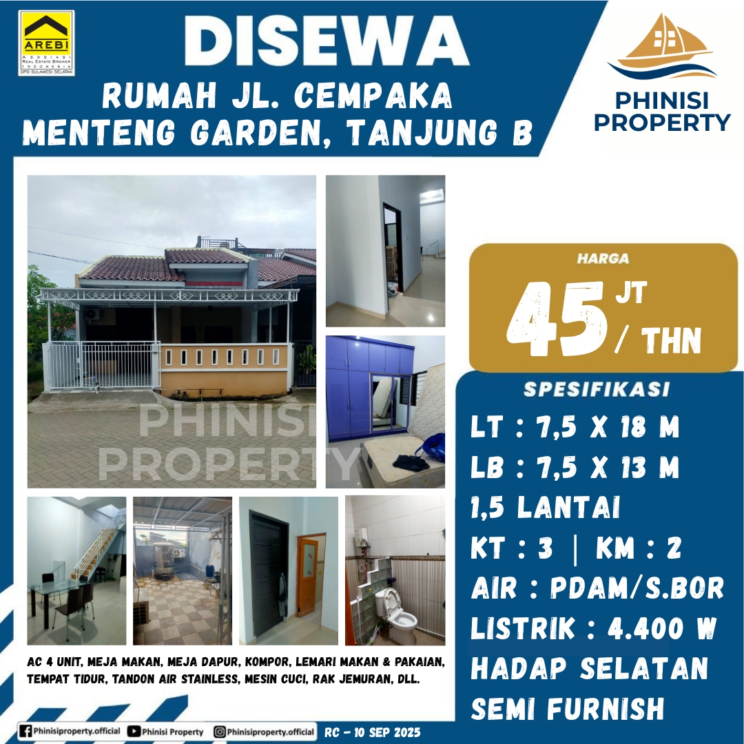 Disewakan segera rumah semi furnish di Jl. Cempaka, Menteng Garden, Tanjung Bunga, sebuah hunian nyaman yang ideal untuk keluarga. Dengan luas tanah 135 meter persegi (7,5 x 18 meter) dan luas bangunan 7,5 x 13 meter, rumah 1,5 lantai ini memiliki tiga kamar tidur dan dua kamar mandi. Properti ini dilengkapi dengan fasilitas modern seperti empat unit AC, meja makan, meja dapur, kompor, lemari pakaian, tempat tidur, tandon air stainless, mesin cuci, dan rak jemuran. Posisinya yang menghadap ke selatan memberikan pencahayaan alami yang baik. Jangan lewatkan kesempatan ini untuk menyewa hunian praktis dan nyaman di lokasi yang strategis.