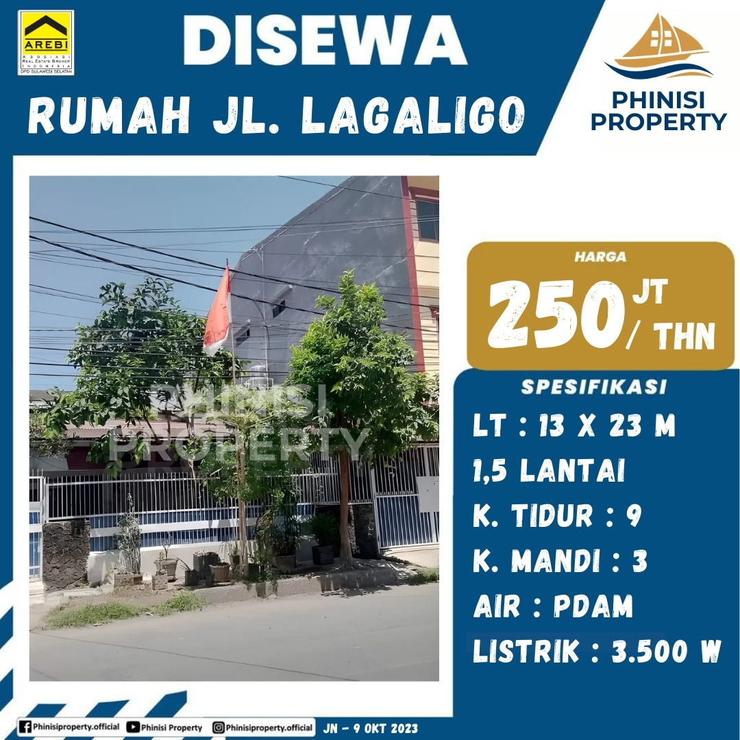 Properti yang satu ini berlokasi di Jalan Lagaligo, ideal untuk disewa oleh perusahaan atau keluarga besar. Memiliki luas tanah 299 meter persegi (13 m x 23 m) dan luas bangunan 1,5 lantai. Rumah ini menawarkan ruang yang sangat luas dengan sembilan kamar tidur dan tiga kamar mandi, sangat cocok untuk kebutuhan hunian atau kantor. Dilengkapi dengan fasilitas air PDAM dan daya listrik 3.500 Watt, rumah ini menawarkan kenyamanan optimal bagi penghuninya.